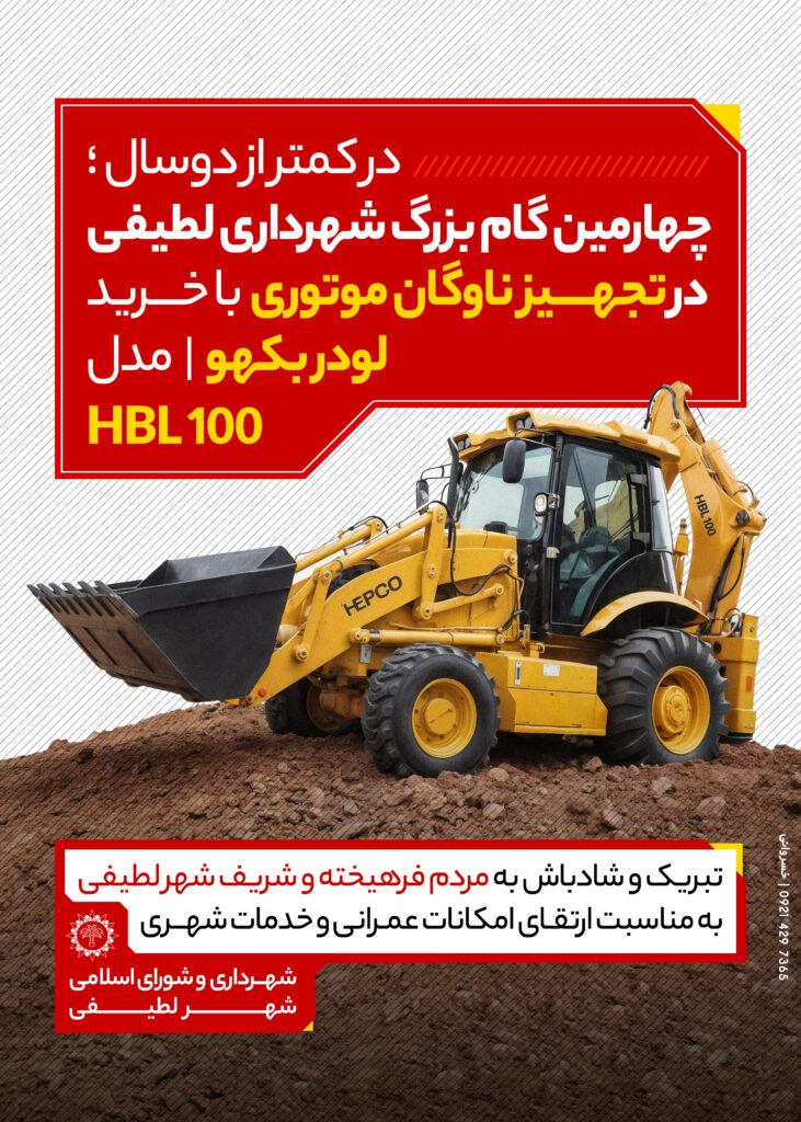 *💎به گزارش روابط عمومی شهرداری لطیفی؛* با اضافه شدن یک دستگاه بیل بکهو “Backhoe Loader” مدل HBL100 به مجموعه ماشین‌آلات شهرداری، روند تجهیز ناوگان موتوری این نهاد خدماتی وارد مرحله جدیدی شد.*بیل بکهو به عنوان یکی از ماشین‌آلات چندمنظوره عمرانی، با قابلیت انجام هم‌زمان عملیات لودر و بیل مکانیکی، نقش مؤثری در اجرای طرح‌های خدماتی و عمرانی دارد.*