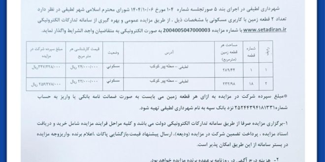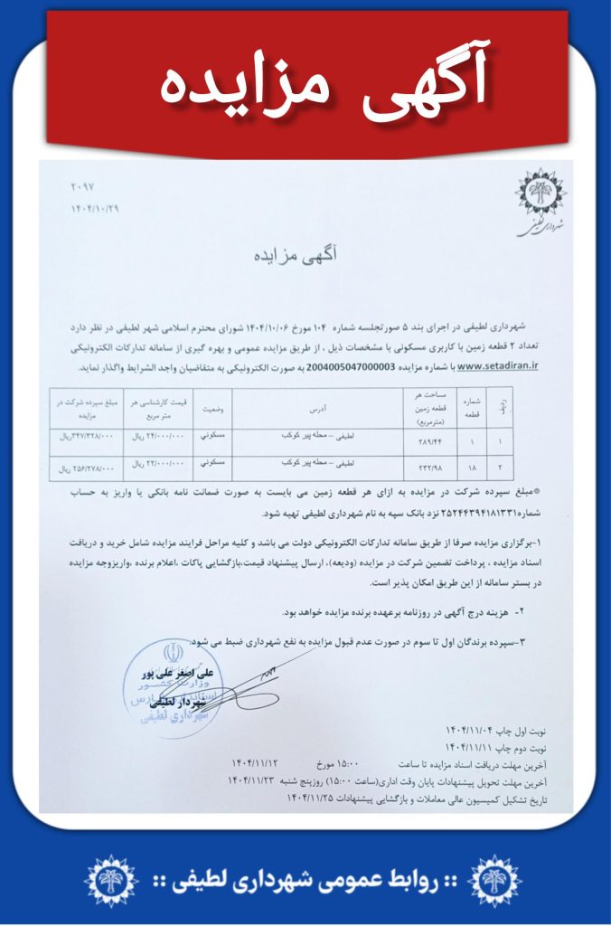 💎به گزارش روابط عمومی شهرداری لطیفی:* شهرداري لطيفي در اجرای بند 5 صورتجلسه شماره 104 مورخ 1404/10/6 شورای محترم اسلامي شهر لطيفي در نظر دارد تعداد 2 قطعه زمين با کاربري مسکوني با مشخصات ذيل ، از طريق مزايده عمومي و بهره گیری از سامانه تدارکات الکترونیکی www.setadiran.ir با شماره مزایده 2004005047000003 به صورت الکترونیکی به متقاضيان واجد الشرايط واگذار نمايد.