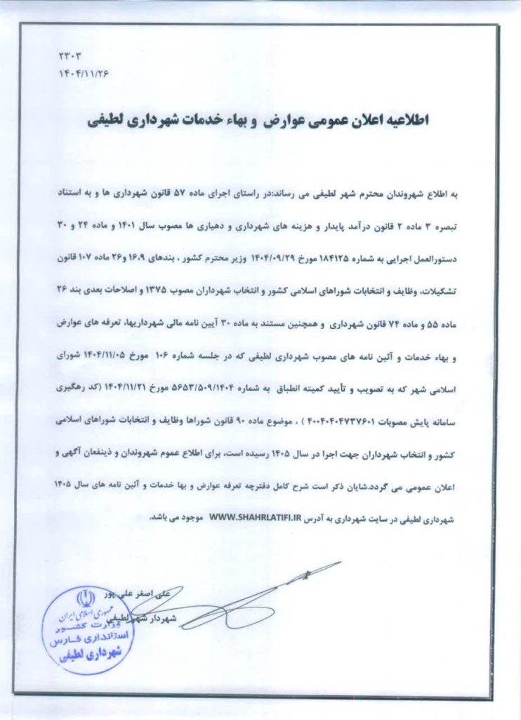 تعرفه عوارض و هزینه بهای خدمات شهرداری لطیفی در سال 1405 منتشر شد. تعرفه عوارض سال 1405 شهرداری لطیفی تعرفه بهاء خدمات سال 1405 شهرداری لطیفی آیین نامه های شهرداری لطیفی